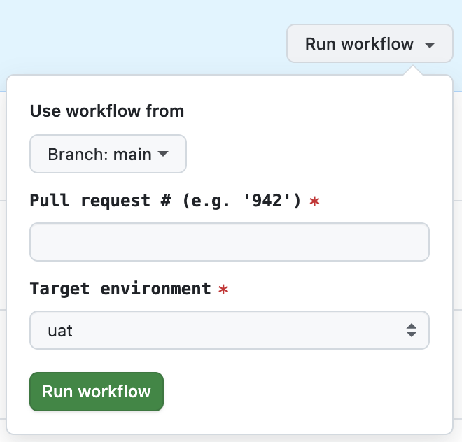 - Pull request #: Number of the pull request to deploy as a preview app (for example, ‘893’ - no leading ‘pr-’ or ‘#’ needed).