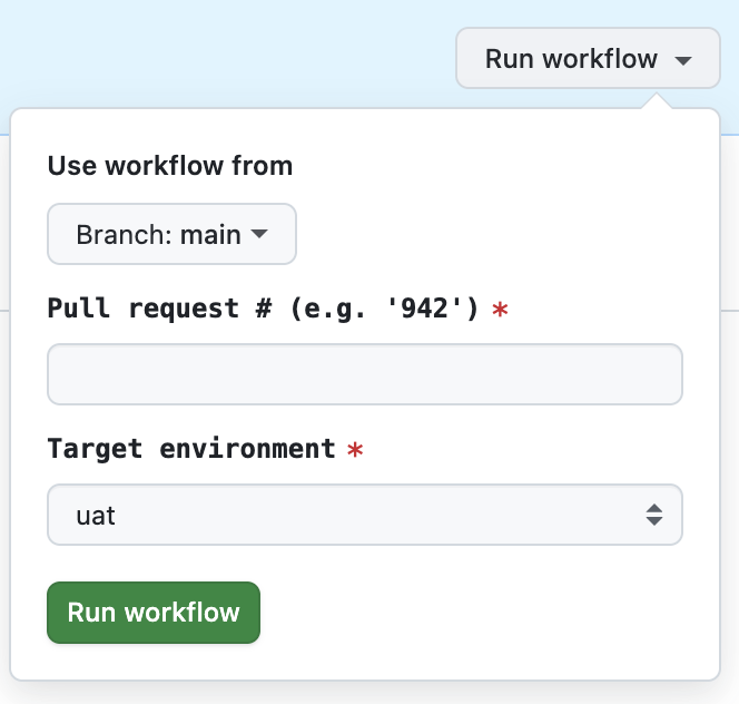 - Pull request #: Number of the pull request to deploy as a preview app (for example, ‘893’ - no leading ‘pr-’ or ‘#’ needed).